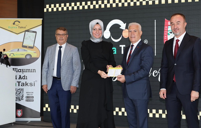 Konuşmaların ardından Fahrettin Bilgit ve Ahmet Çakır tarafından Başkan Mustafa Bozbey’e günün anısına taksi maketi verildi. Daha sonra 18 taksi esnafına ruhsatlarını teslim eden Başkan Mustafa Bozbey, ‘Bursa Taksi’ uygulamasını kullanarak ilk taksiyi çağırdı. Araca ‘Bursa Taksi’ logosunu yapıştıran Başkan Bozbey, taksiye binerek yolculuk yaptı.